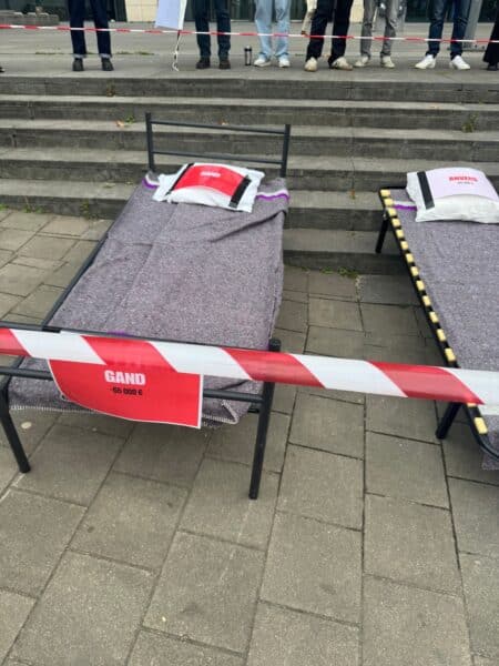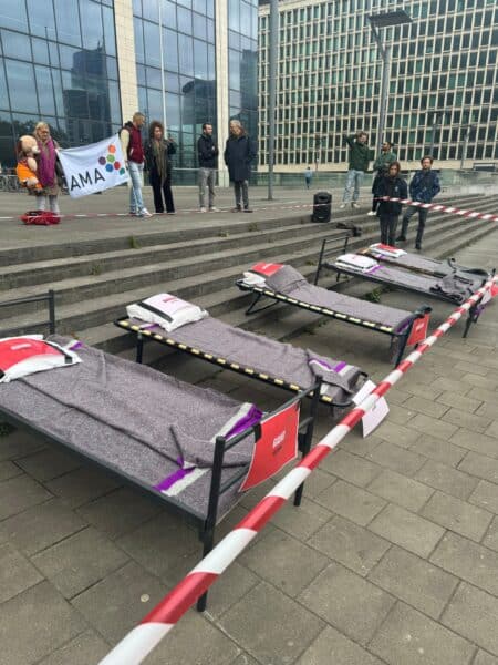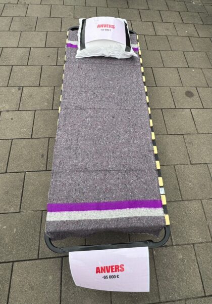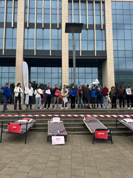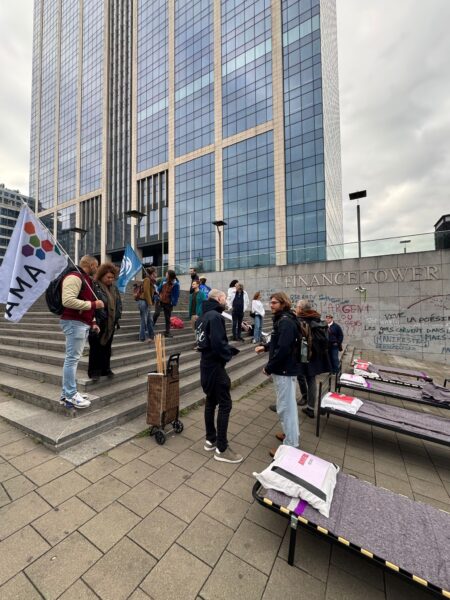 Ce matin, nous avons mené une action coup de poing devant la Tour des Finances pour exiger un cap structurel, durable et coordonné contre le sans-abrisme et le rétablissement des moyens.
