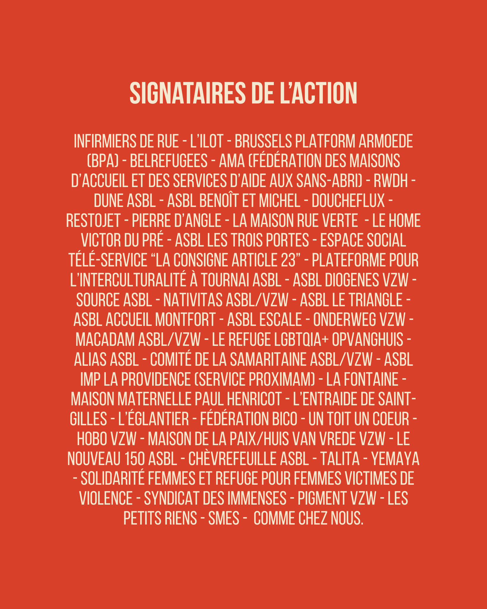 Les organisations estiment que ce désengagement est incohérent : Il contredit la Déclaration de Lisbonne, qui engage la Belgique à mettre fin au sans-abrisme d’ici 2030 ainsi que l’Accord de coopération sur le sans-abrisme de 2014, qui reconnaît la nécessité d’une action concertée entre l’État fédéral, les communautés et les régions.